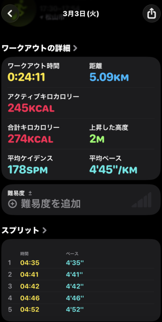 まぁ平均ペースは最近4分台で定着しつつあるな