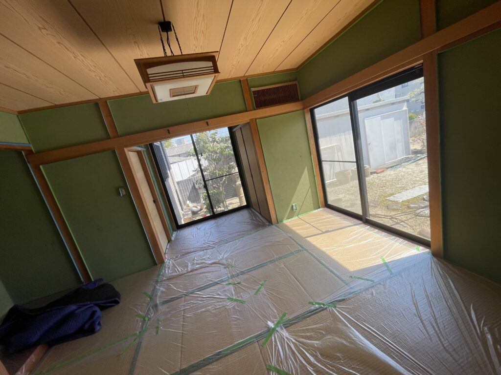 今日はこちらの部屋の内部塗装の養生と下塗り